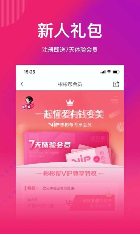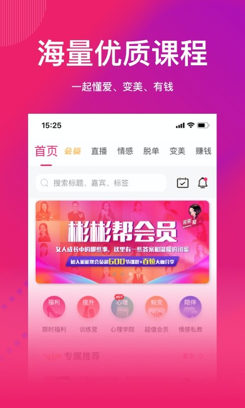 彬彬帮,提供女性情感和成长教育的知识产品,由创始人彬彬携手百位大咖导师用心理学、社会学、经济学等知识体系,以国际化、趣味化传授方式,为女性用户提供专业的情感、心理、职场、理财、美妆、生活等多方位指导。系统性地帮助女性理性面对成长过程中的自我发展,掌握做妈妈、伴侣、女儿、朋友、职场人五个角色的心理能力和知识能量。