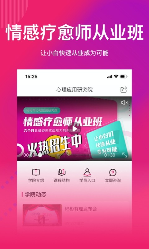 彬彬帮是一款专为女性设计的心理咨询软件,提供情感与心理指导方案,帮助她们应对生活压力和人生挑战。它不仅关注心理健康,还涉及职场、理财、美妆、生活等多个方面。软件功能齐全,包括有趣视频内容、专业私教咨询、系统课程和训练营等,全方位满足用户需求。
