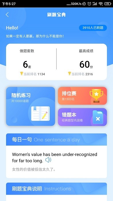 1、进入刷题宝典后,就可以选择排位赛、随机练习、错题本等功能进行查看