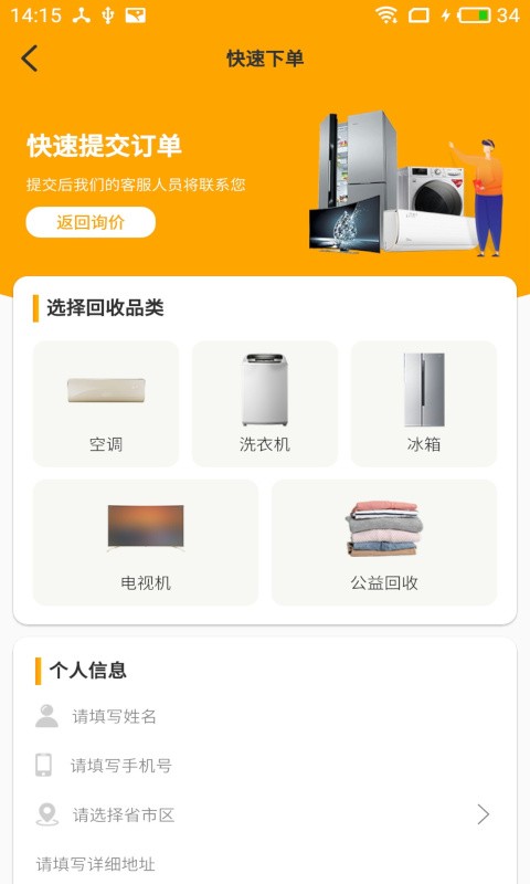 只需要选择需要回收的废品、填写地址和时间,专业的服务人员就会到您指定的地方进回收。