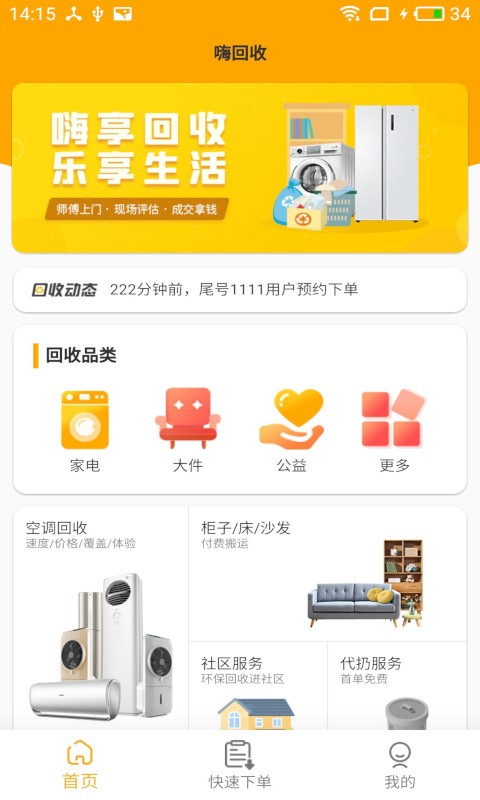嗨回收软件是提供电子产品回收服务的应用app,支持家电回收、电动车回收、大件回收等,覆盖面广发,专业正规,方便快速,订单信息、交易记录一目了然,随时掌握订单状态,提供上门回收、代扔功能,操作简单便捷,让你足不出享受回收服务!