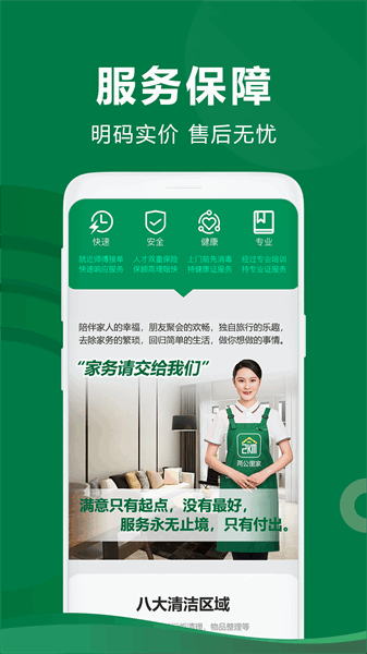 这款app还提供了多种家政服务类型,比如大扫除、擦玻璃、月嫂等等,满足不同家庭的需求。每次服务结束后还能给工作人员打分写评论,这样既能让服务质量得到保障,也能帮助其他用户选择更放心的服务人员。