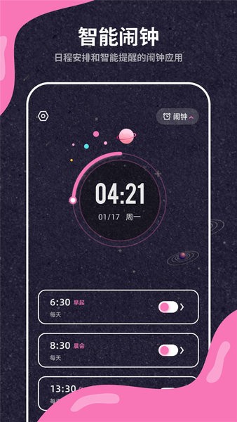 除了有世界时钟、秒表和计时器功能外,还具备许多特色功能,比如:跳过本次、隔天闹钟、工作日闹钟、日历功能、日程管理、倒数日、事项管理、锁屏皮肤等。为您的生活、工作带来极大便利,用户装机必备工具之一,满足不同人群对于时间管理需要!