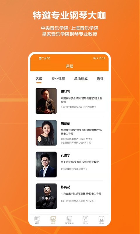 大师录制入门教程,初学者入门就学得正确有质量;单曲多样,兴趣者上手轻松;启蒙进阶考级多套课程,搭建完整学习体系。
