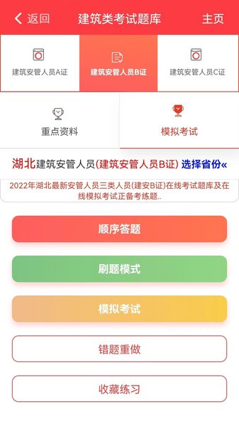 建题帮app提供多种模式练题,顺序练题、刷题模式、在线模拟考试以及错题重做等功能,可以快速帮助通过考试!