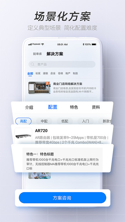 提供分销场景化方案,快速了解方案亮点及销售话术,可基于典型配置一键生成、分享方案报价单。