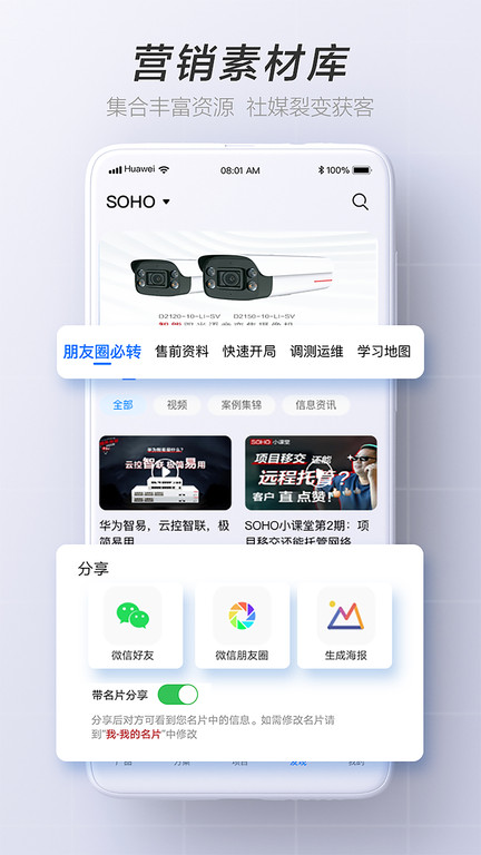 产品/方案卖点、技术知识分享、在线培训赋能、售后实施指导,软文海报、短视频等富媒体内容应有尽有;自定义电子名片,一键分享裂变。