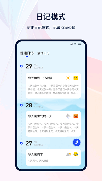 这是一款简单实用的移动版便签,它可以帮助您快速记录与分享工作任务,待办事项,学习计划,购物清单。还可以将日记区分为普通日记和恋爱日记倒数日提醒你再也不忘重要日子。懒得打字还可以录音,音色俱全,简单而有趣。让每个美好的瞬间都不被遗忘。
