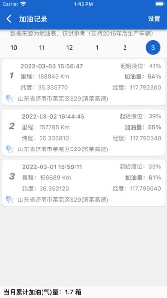 车辆的“燃油管理”可以查看一定时间段内车辆运行里程、运行油耗、平均油耗的情况。