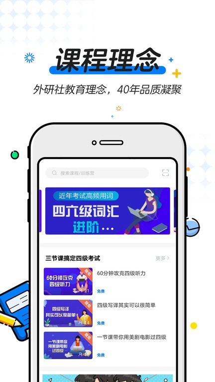 致力于为大学生提供优质的外语类教学培训服务,帮助大学生迅速学习各类英语考试技巧和知识,快速提高英语考试能力。产品涵盖大学英语四六级、考研、出国留学、求职就业等优质精品课程,为用户提供包括直播录播、教辅材料、练习服务、混合式培训等全套备考方案。