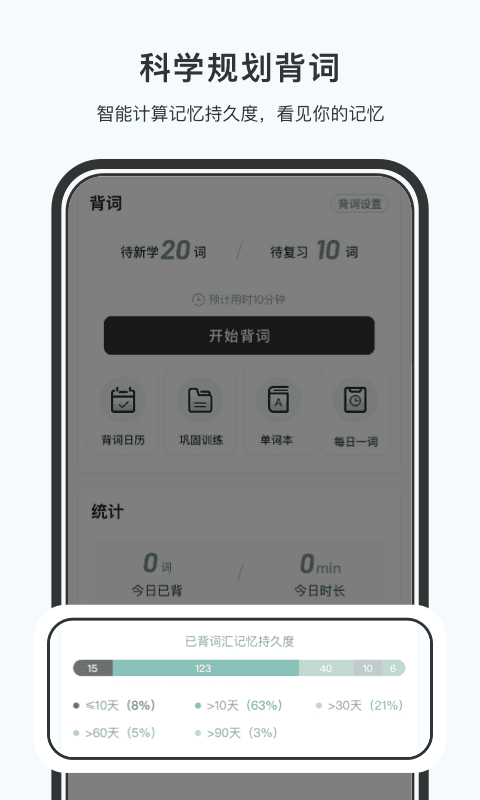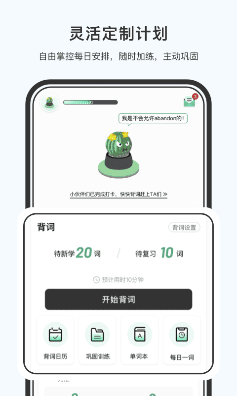自由设定每日学习目标,定时提醒不怕忘,今日事今日毕。背词有计划,考试好通关!