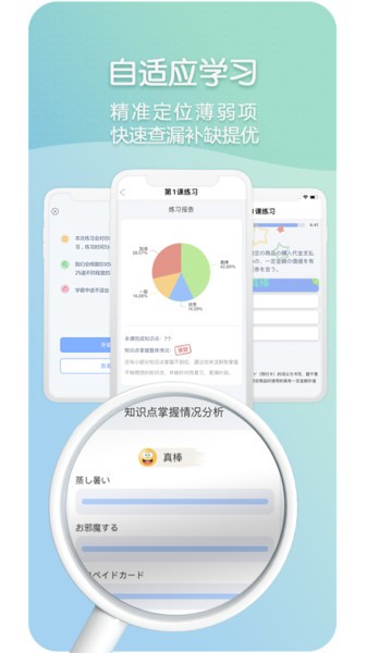 2、自适应练习可精准定位学生所处日语级别,为学生规划适合学生学习的有效路径,从而让学生在避免题海战术的同时,快速有效的提高日语学习成绩和日语高考分数。
