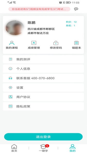 [我的]中可以查看我的课程、参与的考试、考试成绩以及学习记录。