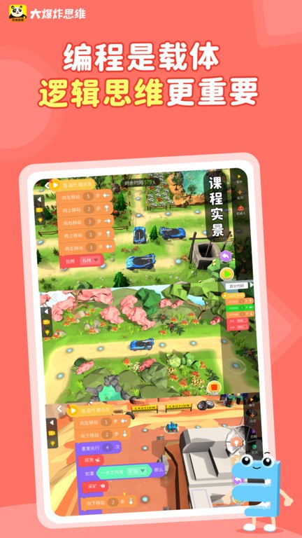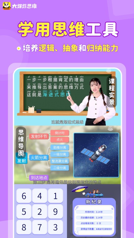大爆炸思维app以 “编程是载体,思维建模更重要 ”为设计思想 ,1门课程,7大能力的为培养目标。开设编程设计、思维导图、 逻辑训练、 人工智能、专注力和记忆力训练 、 生活中编程、科学等环节。