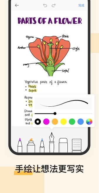 画笔功能可帮助您记下笔记,手写笔记更加利于您纪录生活的细节,以及领感。有不同的画笔颜色和粗细大小。可以用橡皮擦纠正,并且二次编辑。