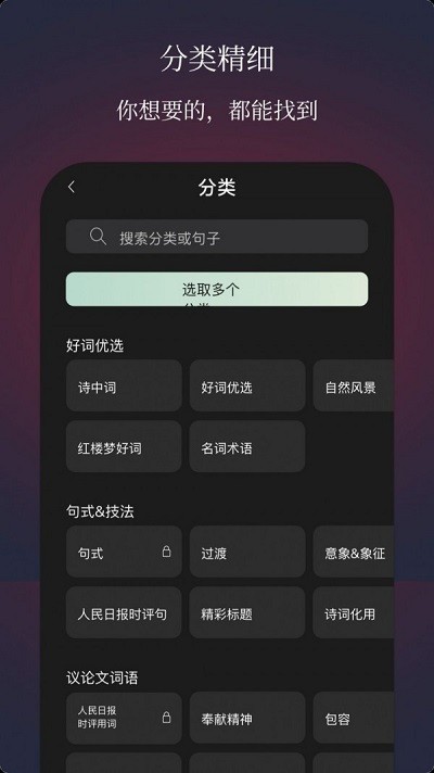 作文手卡软件是致力于为用户提供写作服务的应用app,拥有丰富的作文素材资源,各种模板范文、古典名句、精美词汇语句一网打尽,分类清晰明了,还带来不同风格类型的主题可以使用体验,实时更新,每日精选推荐,启发你的灵感,帮助大家学会写作!