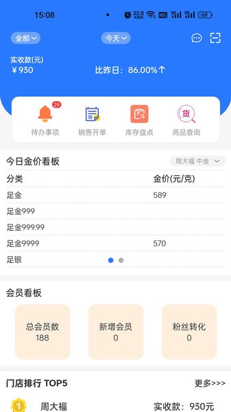 聚能智慧门店最新版是提供珠宝门店经营管理的进销存软件,待办任务即时处理,随时查看,实时记录,各种商品在线查询,一键扫码,掌握商品库存,还支持营收统计分析,提供金价看板、会员看板、门店排行等服务,助力运营营销,高效管理!