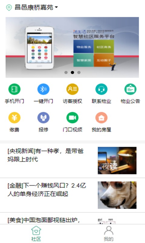 在首页中查看各种央视新闻和美食等资讯内容,使用手机快速开启门禁