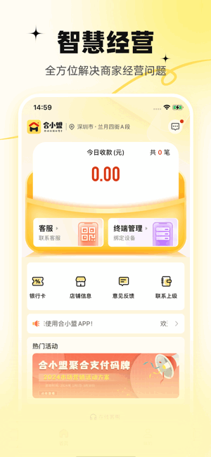 合小盟手机版是提供店铺收银管理的应用平台,适用于中小微商户实用。功能丰富实用,带来一站式收银服务,方便快捷,安全可靠,可以实时记录交易详情数据,查看店铺信息,还提供热门活动参与,助力店铺运营管理,全方位解决商家经营问题,操作简单!