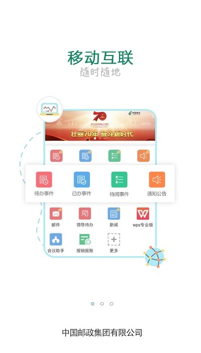 “邮我行软件”是中国邮政集团掌上办公官方APP。功能包括:网点查询,运费估算,公文审批、邮箱、新闻、通讯录、IM及时通讯、打卡、会议助理、网盘等功能