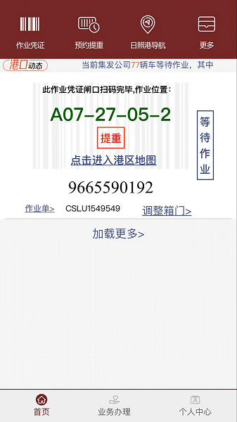 作业凭证、收箱信息、预约作业、在场箱位、车辆解锁、港区导航