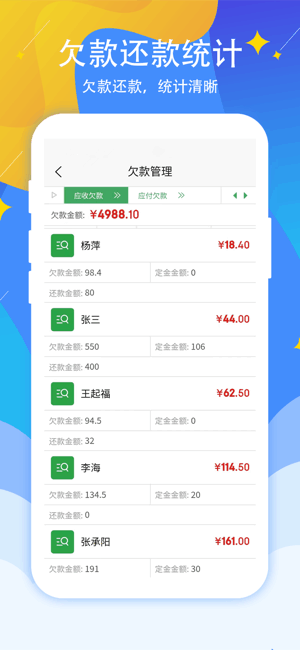 3、查询客户或员工就可以显示来往明细,包括各类欠款与收款账号与截图凭证。