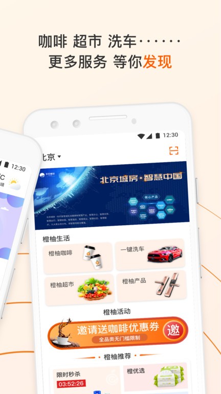 一键开门、访客邀请、通行人脸、车辆登记、物业缴费、报修报事、投诉表扬、物业公告、管家服务、智能充电、橙柚超市、橙柚咖啡、一键洗车、智能设备・・・・・・