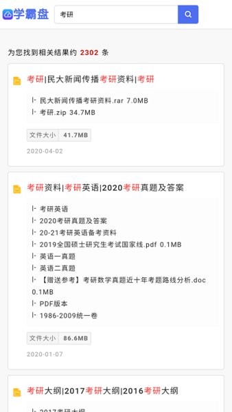 学霸盘网盘搜索是随时都可以搜索多个网盘之中学习资料的搜索引擎,帮助用户可以获得更多的学习资源,海量的资源都可以在软件之中找到,通过软件随时可以对这些资源进行下载。