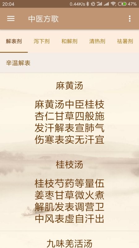 中医方歌app是汇集多种中医药方的巧记法。中医是我国的国粹,中医中的一些药方往往很难记忆,软件中将一些药方编成简单的歌诀,来让中医爱好者和学习者更好的去记忆中医药方,非常实用好记。