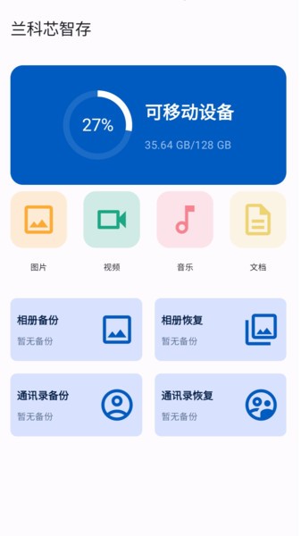 兰科芯智存app是一款提供智能存储管理相册文件的应用工具,体积十分的小巧,不占空间内存,支持图片、视频、音乐以及文档文件存储,分类管理,还支持相册备份与恢复、通讯录备份与恢复功能,操作简单,轻松管理资源数据,好用实用!