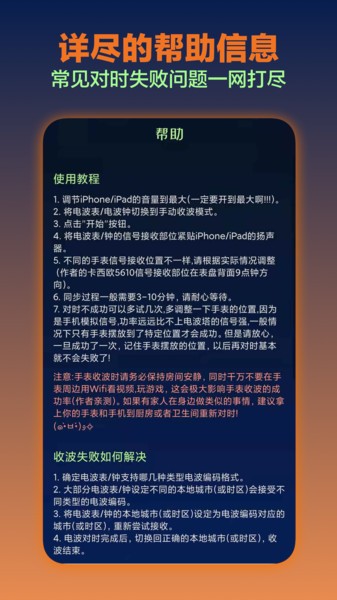 这个App真的很方便!它能模拟全球6座电波基站的信号,支持各种类型的电波表和时钟,比如2局、3局一直到6局的设备都能用。操作简单,界面设计也很友好,不用太复杂的步骤就能完成对时。
