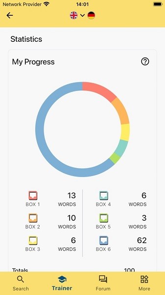 通过训练功能,您可以利用("幻灯秀")或提问的方式练习背诵生词。为了达到事半功倍的最佳学习效果,您还可以事先为各种生词进行分类。无论在上线或离线的状态下,您都可以使用训练功能,同时,也能随时把您手机或平板电脑上的词汇及练习统计与网页中的信息进行比对。