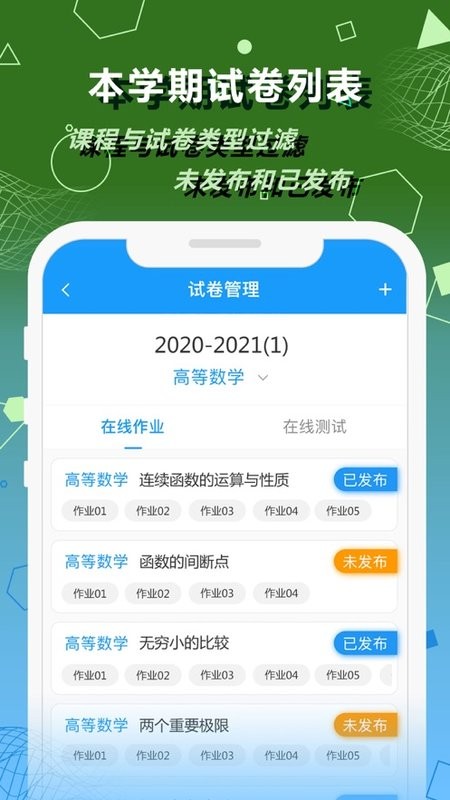 数苑校园教师端APP,是与PC端《数苑在线作业与在线测试系统》配套的、面向教师的手机客户端软件。支持各类课程的试卷管理、在线作业与课堂测试的发布管理、试卷与试题的批改、成绩的分析管理等。
