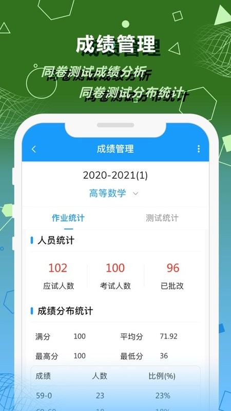 6、成绩管理:对批改完成后的作业测试考试成绩分类管理与统计分析
