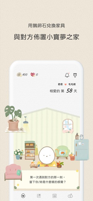 使用您在应用程序中收集的鹅卵石(应用程序内货币),您可以购买各种物品来装饰小蛋蛋的房间!