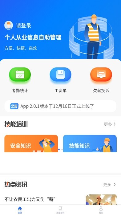 陇明公工人端app是供从业人员使用的管理软件,能够在手机上查看自己的详细考勤和工资信息,还可以在线参与技能培训,包括了技能知识以及安全知识,同时可以查看相关的工友相关资讯以及最新的政策法规,对于欠薪行为还可以在线举报。
