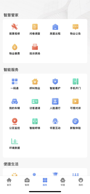 一码通、智能看护、访客邀请、邻里互动、环境数据等