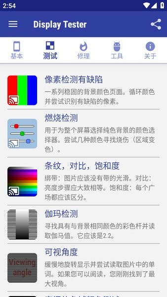 DisplayTester 可以测试设备 LCD/OLED 屏幕的几乎所有方面。使用 Google Cast 可以测试电视的显示质量。它旨在允许在带有软键的设备上进行全屏测试(在 ICS 及更高版本中隐藏软键,在 KitKat 及更高版本中为沉浸式模式)。