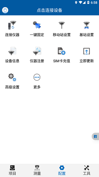 连接仪器、一键固定、移动站设置、基站设置、设备信息、仪器注册