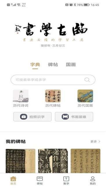 『临古学书』是为书友开发的一款专业的书法学习平台,涵盖了古今历代碑帖,大量高清字帖,拓本,同时可查询行草隶篆楷各种书法字体,亦增添了碑帖临摹、书法字典、集字创作、拍照识字等模块供书友使用,且收录历代国画、古文诗词供书友欣赏,书画装裱功能为书友作品润色,是书法爱好者学习及创作的良师益友。