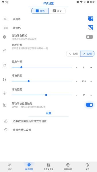 非常好用的安卓手机音量控制面板调节工具,你可以自定义音量组件显示样式,随意更改音量显示的滑块样式,你也可以在组件上添加一个亮度滑块,根据不同的的消息提示会有不同的亮度显示,便于区分消息类型!