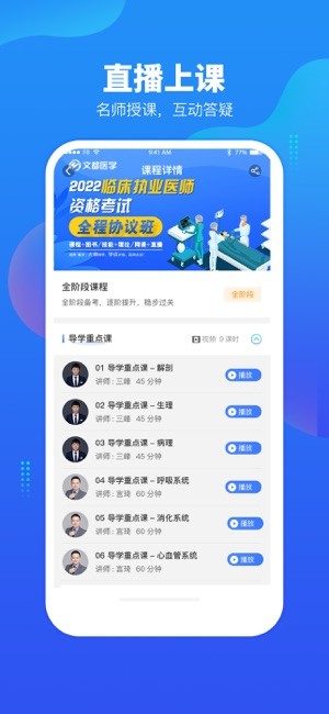 文都医考提供海量精品课程,不同科目,丰富的选择,所有课程应有尽有!重点突出、寓教于乐、轻松掌握考点。清新的界面和人性化的操作,让您随时随地的高效学习名师课程,享受到线上直接和名师面对面、感受名师精彩授课、生动讲解的综合性的服务。