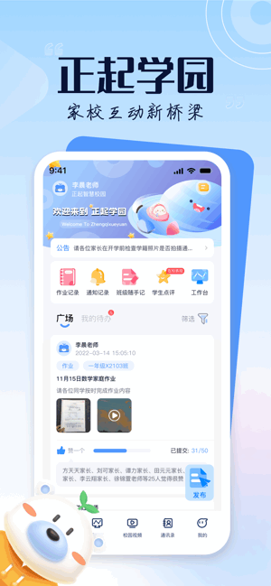 正起学园教师版app是一款为校园老师提供的教育教学管理服务软件,可以帮助管理班级学生,高效教学,精准推送通知消息给每一位学生家长。还可以随时发布学生动态,记录学生行为,及时与学生的家长进行交流沟通,有效提升效率!