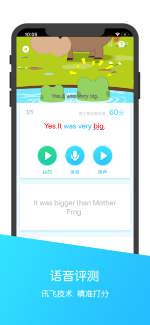 2、角色配音,尽情演绎角色配音功能让孩子在优美地道的英语配音指导下大胆发声、尽情演绎绘本和动画的角色、讯飞智能语音技术为配音表演精准打分,能把自己的配音作品分享到朋友圈,精彩的配音还有机会上榜“高手秀场”,被所有的小朋友看到。
