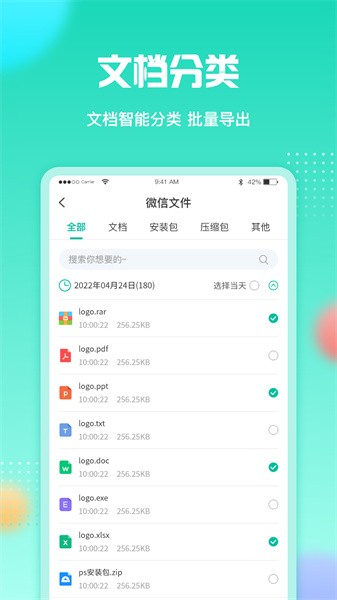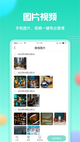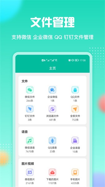 微信图片,文件,视频自动分类,QQ图片,文件,视频自动分类,再也不用费力查找聊天记录,微信和QQ无需收藏文件,配合微信语音合并转发功能大大增加了工作效率。重要文件支持导出备份,避免微信清理时丢失。