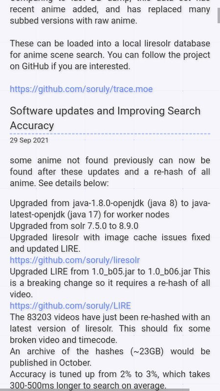 trace.moe 是一个动漫场景搜索引擎,可帮助用户通过屏幕截图追溯原始动漫。它在~30000小时的动漫中搜索并找到最佳匹配的场景。它可以告诉动漫,情节和场景出现的确切时间。由于搜索结果可能不正确,因此它会提供几秒钟的预览以进行验证。有很多动漫屏幕盖和 GIF 在没有引用来源的情况下在互联网上传播。trace.moe就是为了解决这个问题而构建的,帮助人们了解源动漫,而不仅仅是内容农场中的一些随机工作!