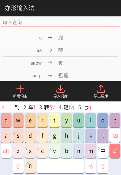 亦形输入法手机版是一款很实用的五笔类输入工具,操作简单又方便,能满足各种打字需求。它不仅支持新增词条、导入词库、导出词库,还自带精美主题皮肤,可以自定义界面装扮,感觉特别贴心。