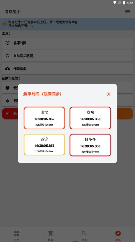 淘京猪手为京东、天猫等购物平台的双十一活动提供帮助。不仅可以自动完成任务,还可以查询商品的历史价格,抢购商品等功能。操作简单,使用方便,专门为双十一狂欢节打造的辅助工具,支持悬浮窗结构。