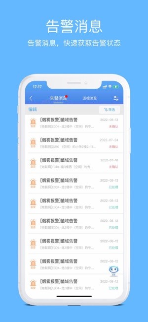 将监测到的设备异常进行告警提醒,用户可对告警信息进行查看处理设备异常事件。