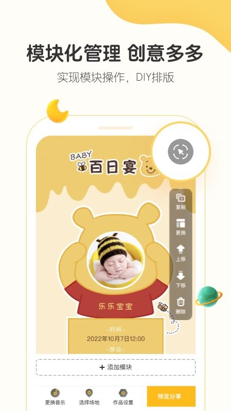 小宝拾光app最新版可以在手机上制作个性化宝宝请柬和邀请函,包括生日、百日宴等,有丰富的模板素材可以选择,支持在手机上添加个性化的音乐背景,支持进行音乐裁剪,轻松匹配各种模板,能够自己添加文字和贴纸等。